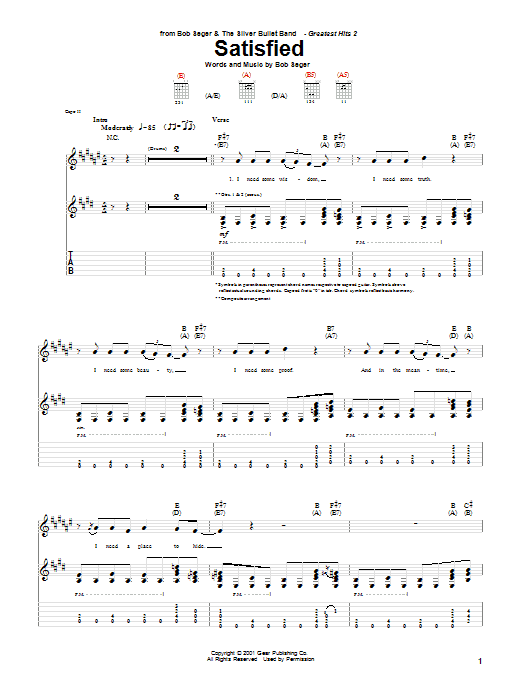 Download or print Bob Seger Satisfied sheet music, chords and digital score arranged for Guitar Tab. This Rock score includes 8 page(s).