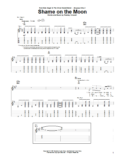 Download or print Bob Seger Shame On The Moon sheet music, chords and digital score arranged for Lead Sheet / Fake Book. This Pop score includes 2 page(s).