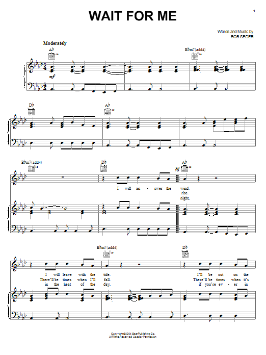 Download or print Bob Seger Wait For Me sheet music, chords and digital score arranged for Piano, Vocal & Guitar Chords (Right-Hand Melody). This Pop score includes 5 page(s).