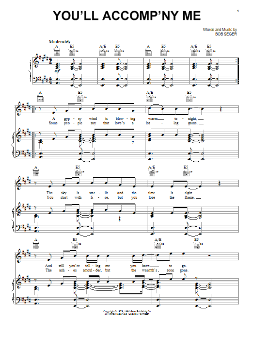 Download or print Bob Seger You'll Accomp'ny Me sheet music, chords and digital score arranged for ChordBuddy. This Pop score includes 2 page(s).
