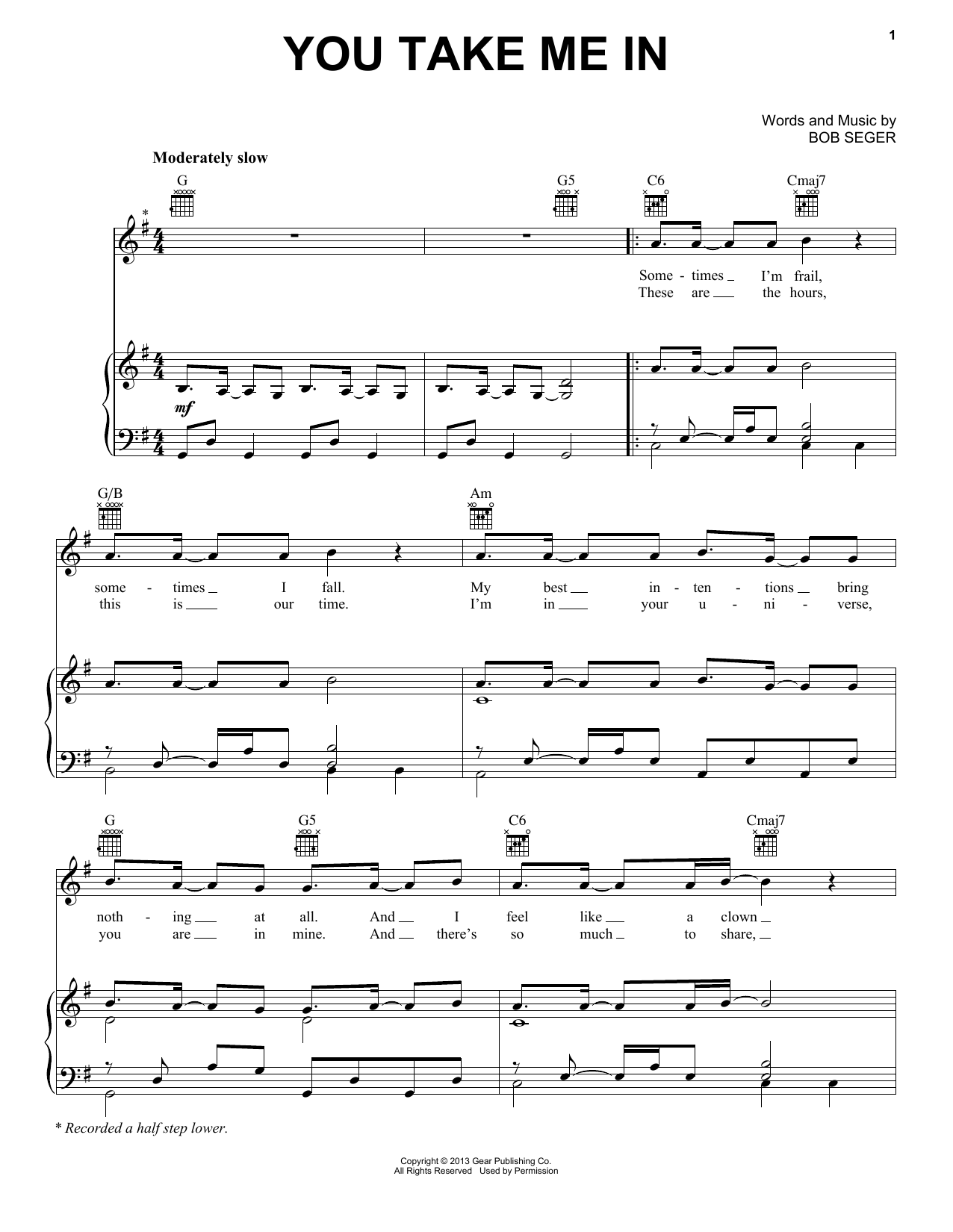 Download or print Bob Seger You Take Me In sheet music, chords and digital score arranged for Piano, Vocal & Guitar Chords (Right-Hand Melody). This Pop score includes 3 page(s).