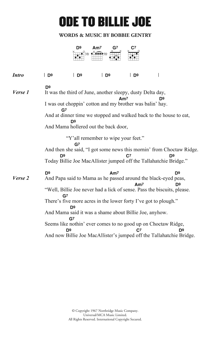 Download or print Bobbie Gentry Ode To Billie Joe sheet music, chords and digital score arranged for Guitar Chords/Lyrics. This Country score includes 2 page(s).