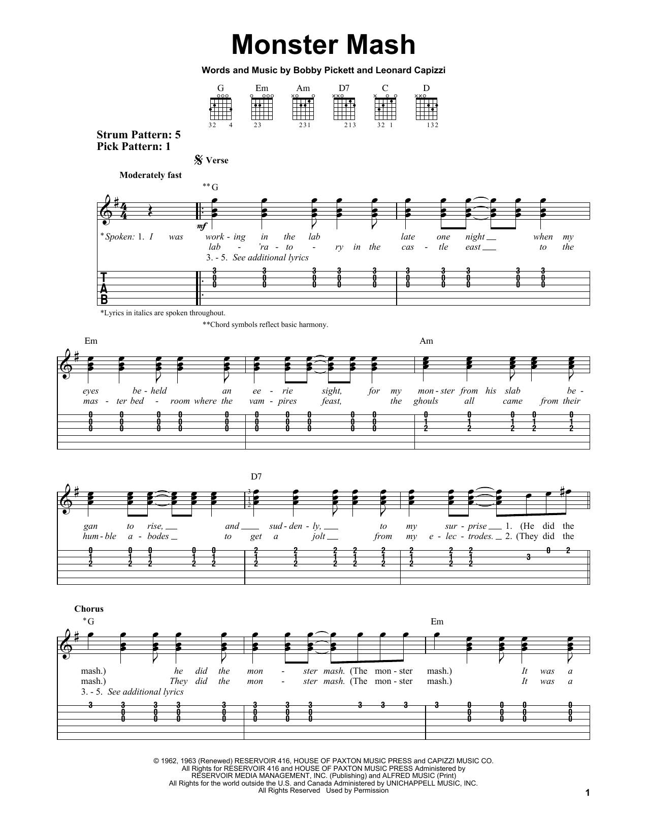 Download or print Bobby "Boris" Pickett Monster Mash sheet music, chords and digital score arranged for Piano, Vocal & Guitar Chords (Right-Hand Melody). This Pop score includes 6 page(s).