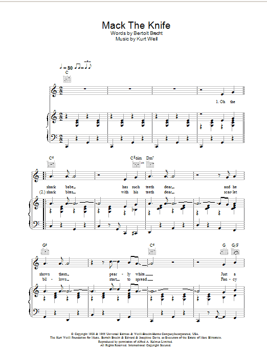 Download or print Bobby Darin Mack The Knife sheet music, chords and digital score arranged for Baritone Ukulele. This Jazz score includes 2 page(s).