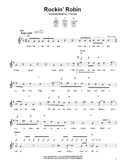 Download or print Bobby Day Rockin' Robin sheet music, chords and digital score arranged for Piano, Vocal & Guitar Chords (Right-Hand Melody). This Oldies score includes 3 page(s).