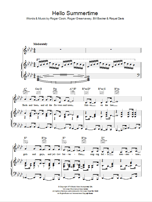 Download or print Bobby Goldsboro Hello Summertime sheet music, chords and digital score arranged for Piano, Vocal & Guitar Chords. This Pop score includes 6 page(s).