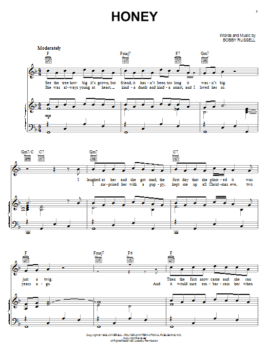 Download or print Bobby Goldsboro Honey sheet music, chords and digital score arranged for Piano, Vocal & Guitar Chords (Right-Hand Melody). This Country score includes 4 page(s).