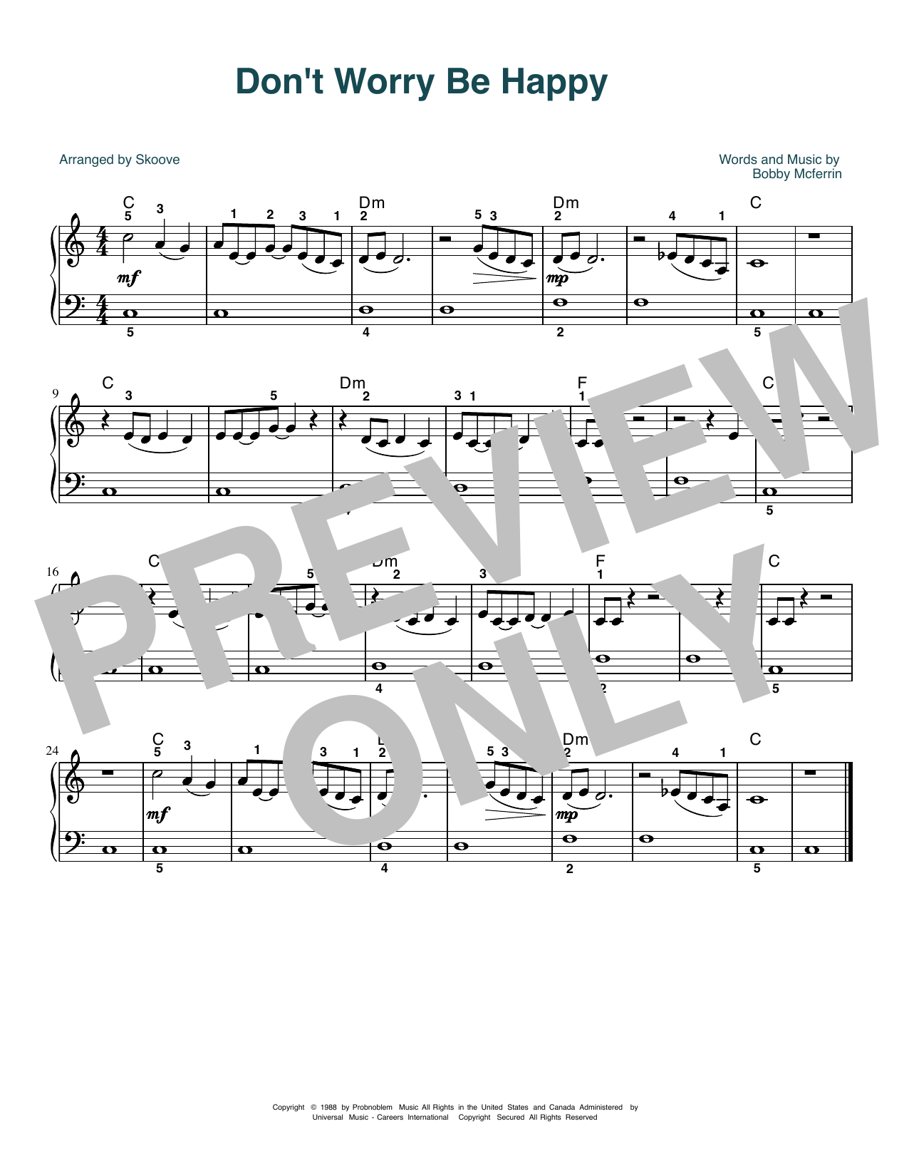 Download or print Bobby McFerrin Don't Worry, Be Happy (arr. Skoove) sheet music, chords and digital score arranged for Beginner Piano (Abridged). This Pop score includes 1 page(s).