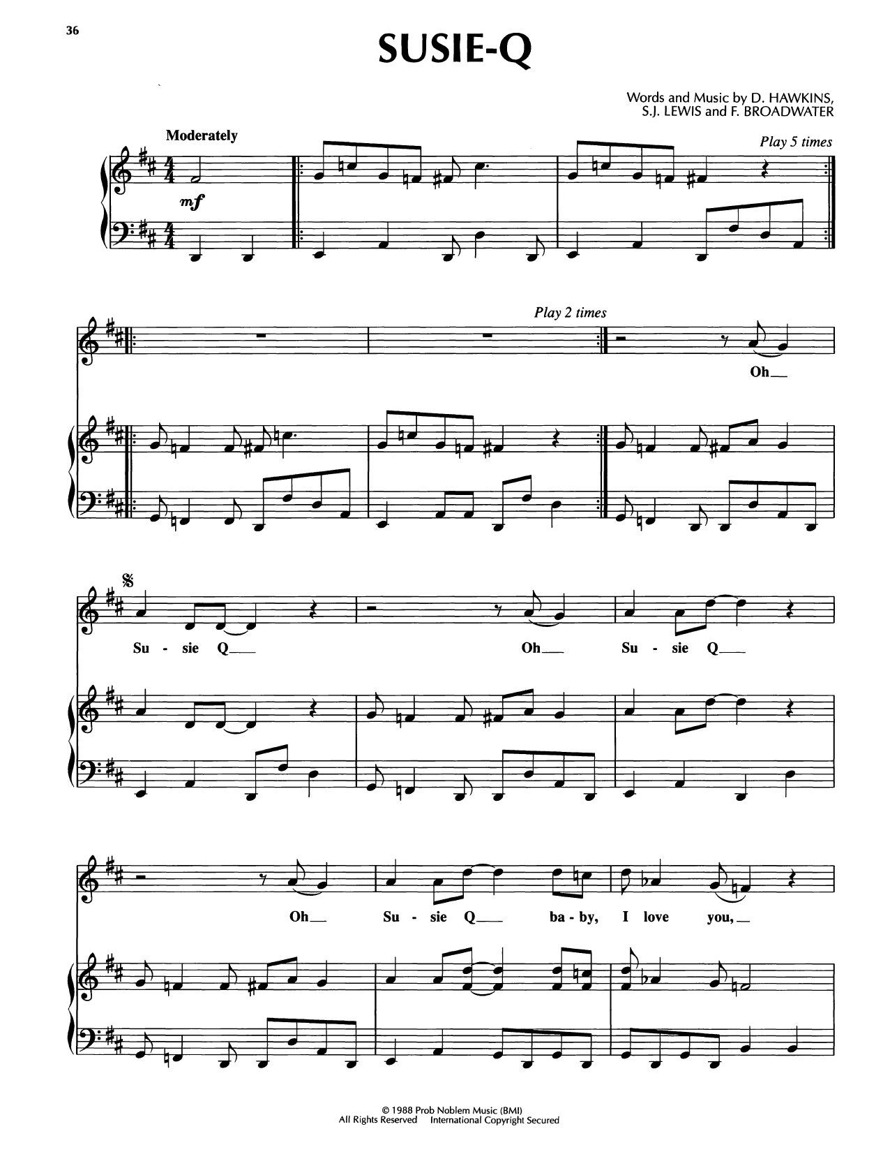 Download or print Bobby McFerrin Susie-Q sheet music, chords and digital score arranged for Piano, Vocal & Guitar Chords (Right-Hand Melody). This Country score includes 4 page(s).