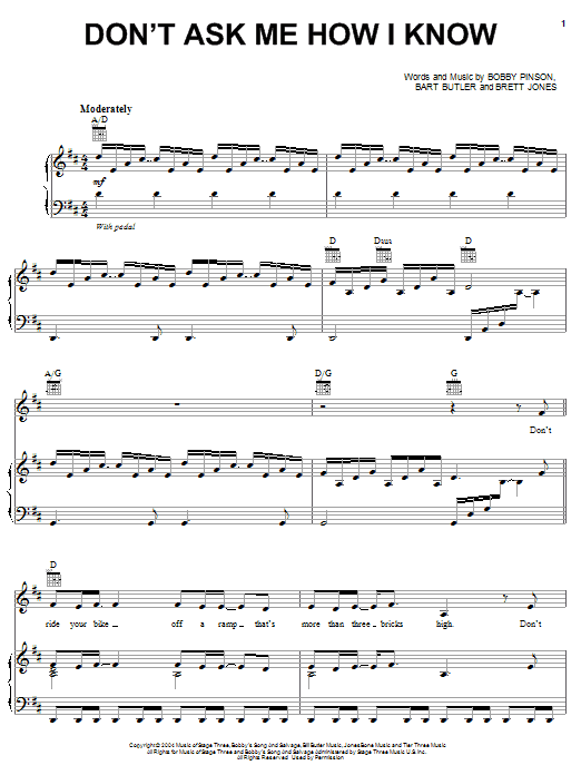 Download or print Bobby Pinson Don't Ask Me How I Know sheet music, chords and digital score arranged for Piano, Vocal & Guitar Chords (Right-Hand Melody). This Country score includes 9 page(s).