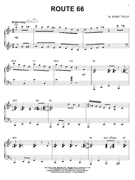 This composition is beautifuly arranged for Piano includes 5 page(s). It is performed by Bobby Troup. The style of the score is 'Jazz'. Catalog SKU number of the notation is 71369.