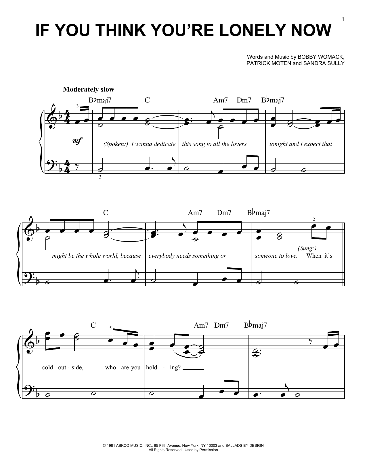 Download or print Bobby Womack If You Think You're Lonely Now sheet music, chords and digital score arranged for Easy Piano. This Pop score includes 3 page(s).