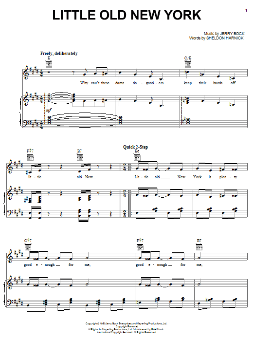Download or print Bock & Harnick Little Old New York sheet music, chords and digital score arranged for Piano, Vocal & Guitar Chords (Right-Hand Melody). This Musical/Show score includes 6 page(s).