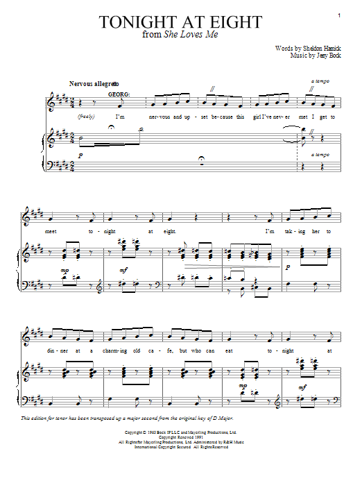 Download or print Bock & Harnick Tonight At Eight sheet music, chords and digital score arranged for Piano & Vocal. This Musical/Show score includes 7 page(s).