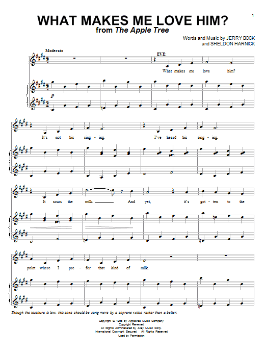 Download or print Bock & Harnick What Makes Me Love Him? sheet music, chords and digital score arranged for Piano & Vocal. This Musical/Show score includes 4 page(s).