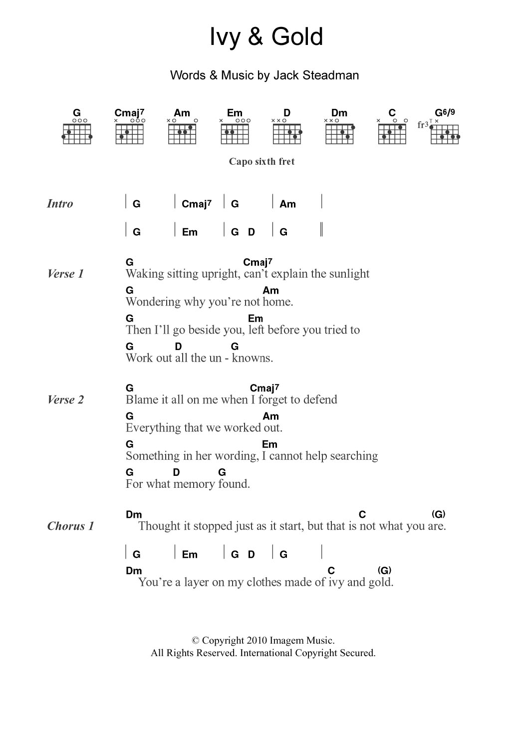 Download or print Bombay Bicycle Club Ivy and Gold sheet music, chords and digital score arranged for Guitar Chords/Lyrics. This Pop score includes 2 page(s).