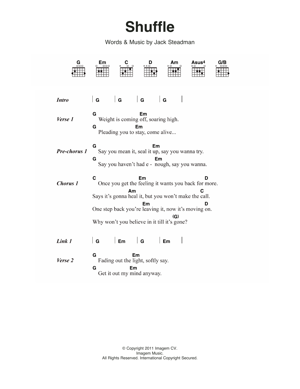 Download or print Bombay Bicycle Club Shuffle sheet music, chords and digital score arranged for Guitar Chords/Lyrics. This Pop score includes 3 page(s).
