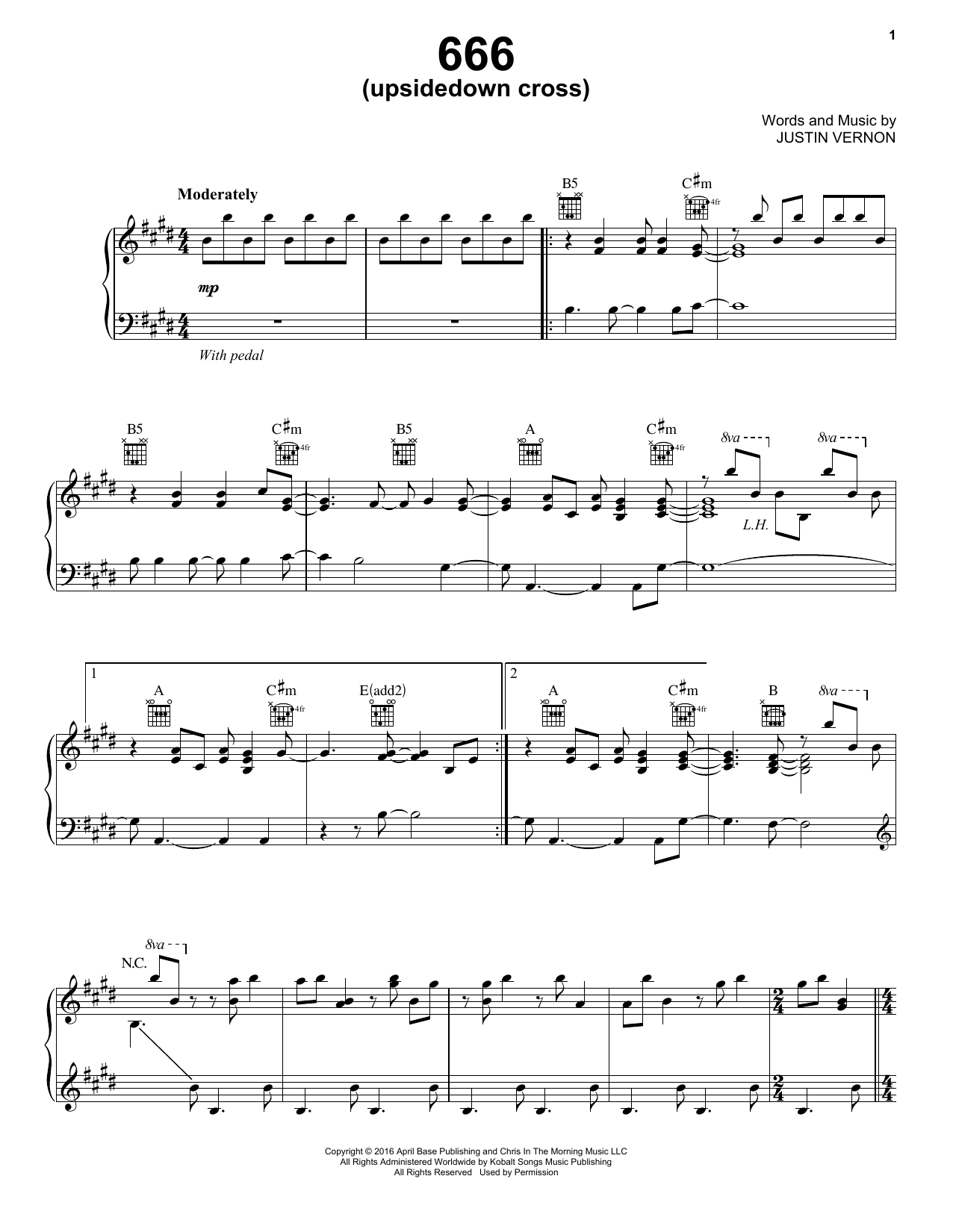 Download or print Bon Iver 666 (upsidedown cross) sheet music, chords and digital score arranged for Piano, Vocal & Guitar Chords (Right-Hand Melody). This Pop score includes 7 page(s).