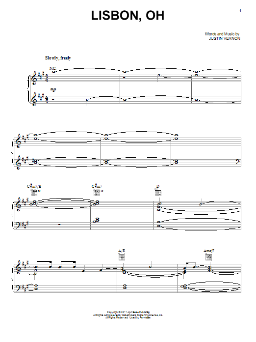Download or print Bon Iver Lisbon, OH sheet music, chords and digital score arranged for Piano, Vocal & Guitar Chords (Right-Hand Melody). This Alternative score includes 2 page(s).