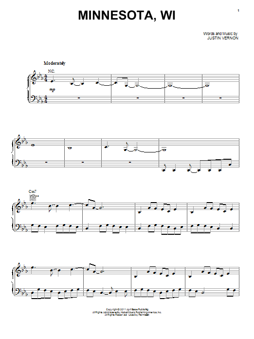 Download or print Bon Iver Minnesota, WI sheet music, chords and digital score arranged for Piano, Vocal & Guitar Chords (Right-Hand Melody). This Alternative score includes 8 page(s).