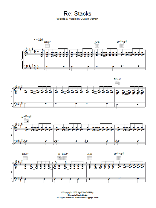 Download or print Bon Iver Re: Stacks sheet music, chords and digital score arranged for Guitar Chords/Lyrics. This Rock score includes 3 page(s).