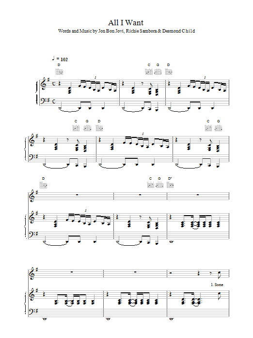 Download or print Bon Jovi All I Want sheet music, chords and digital score arranged for Piano, Vocal & Guitar Chords. This Pop score includes 7 page(s).