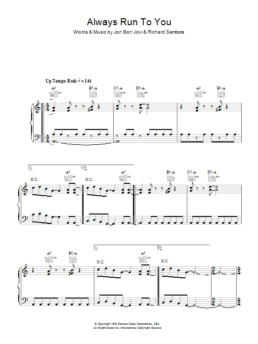 Download or print Bon Jovi Always Run To You sheet music, chords and digital score arranged for Piano, Vocal & Guitar Chords. This Pop score includes 6 page(s).