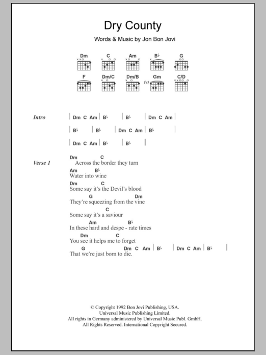 Download or print Bon Jovi Dry County sheet music, chords and digital score arranged for Guitar Chords/Lyrics. This Rock score includes 6 page(s).