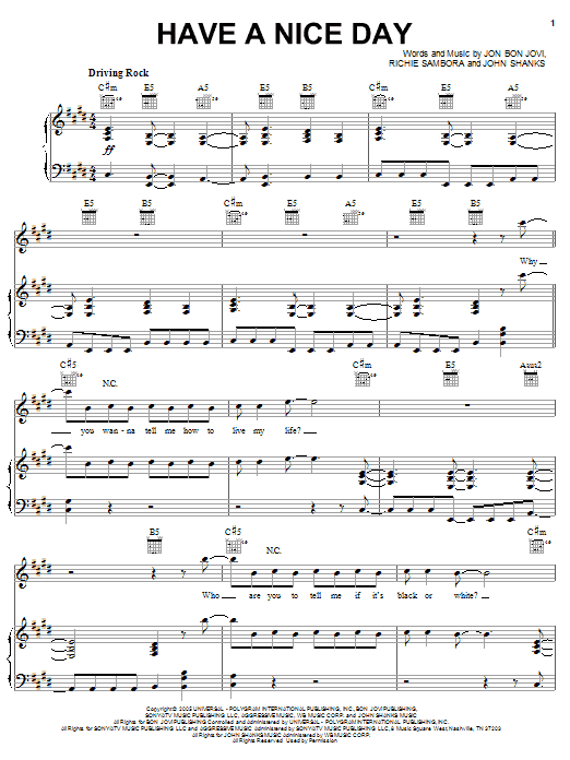 Download or print Bon Jovi Have A Nice Day sheet music, chords and digital score arranged for Piano, Vocal & Guitar Chords (Right-Hand Melody). This Pop score includes 7 page(s).
