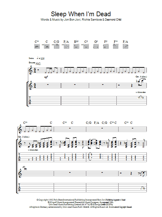 Download or print Bon Jovi I'll Sleep When I'm Dead sheet music, chords and digital score arranged for Guitar Tab. This Pop score includes 9 page(s).