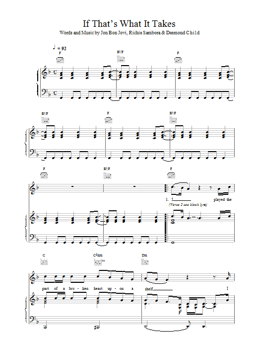 Download or print Bon Jovi If That's What It Takes sheet music, chords and digital score arranged for Piano, Vocal & Guitar Chords. This Pop score includes 7 page(s).