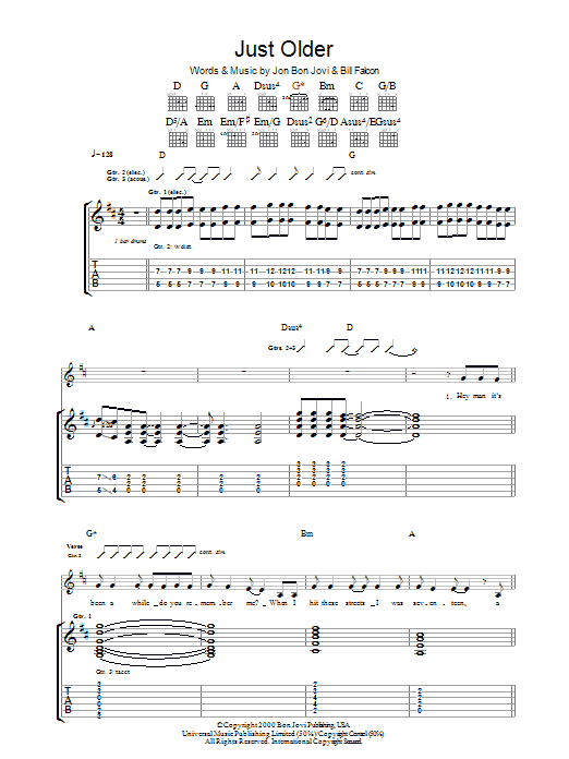 Download or print Bon Jovi Just Older sheet music, chords and digital score arranged for Guitar Tab. This Rock score includes 9 page(s).