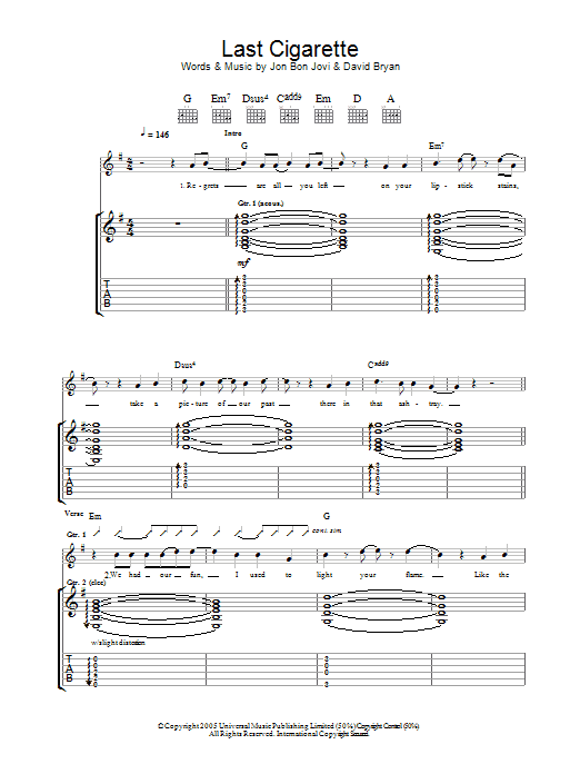 Download or print Bon Jovi Last Cigarette sheet music, chords and digital score arranged for Guitar Tab. This Rock score includes 8 page(s).