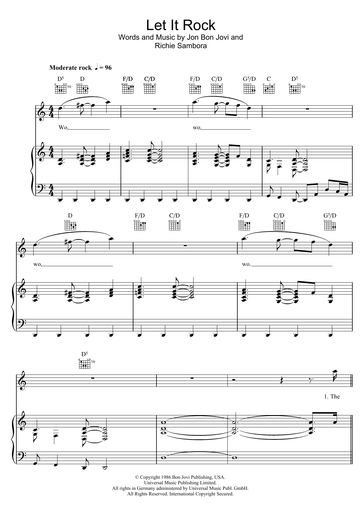 Download or print Bon Jovi Let It Rock sheet music, chords and digital score arranged for Piano, Vocal & Guitar Chords. This Pop score includes 6 page(s).