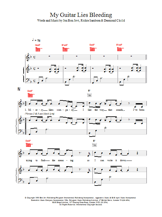 Download or print Bon Jovi My Guitar Lies Bleeding sheet music, chords and digital score arranged for Piano, Vocal & Guitar Chords. This Pop score includes 7 page(s).