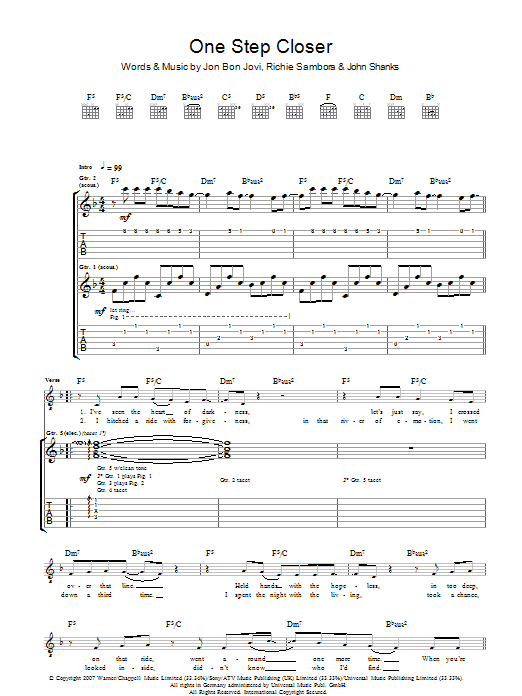 Download or print Bon Jovi One Step Closer sheet music, chords and digital score arranged for Piano, Vocal & Guitar Chords (Right-Hand Melody). This Pop score includes 6 page(s).