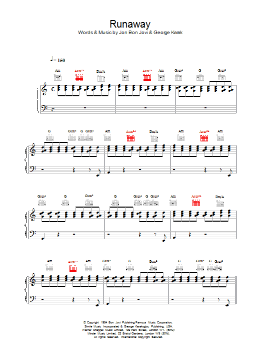 Download or print Bon Jovi Runaway sheet music, chords and digital score arranged for Piano, Vocal & Guitar Chords (Right-Hand Melody). This Metal score includes 5 page(s).