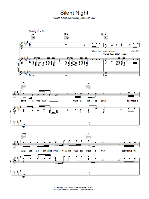 Download or print Bon Jovi Silent Night sheet music, chords and digital score arranged for Piano, Vocal & Guitar Chords. This Pop score includes 4 page(s).