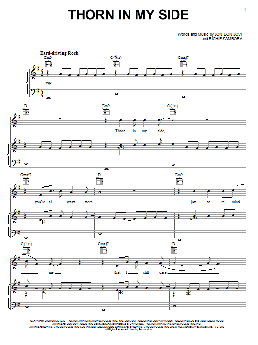 Download or print Bon Jovi Thorn In My Side sheet music, chords and digital score arranged for Piano, Vocal & Guitar Chords (Right-Hand Melody). This Pop score includes 9 page(s).