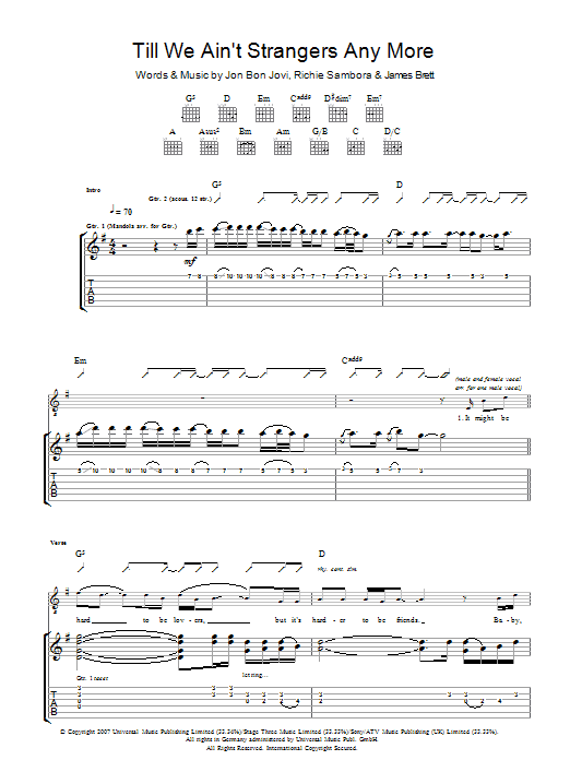 Download or print Bon Jovi Till We Ain't Strangers Anymore sheet music, chords and digital score arranged for Guitar Tab. This Rock score includes 7 page(s).