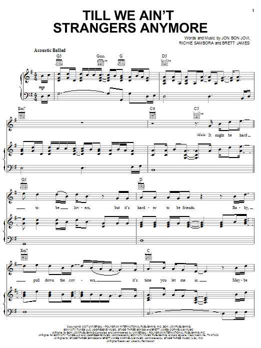 Download or print Bon Jovi featuring LeAnn Rimes Till We Ain't Strangers Anymore sheet music, chords and digital score arranged for Piano, Vocal & Guitar Chords (Right-Hand Melody). This Country score includes 9 page(s).