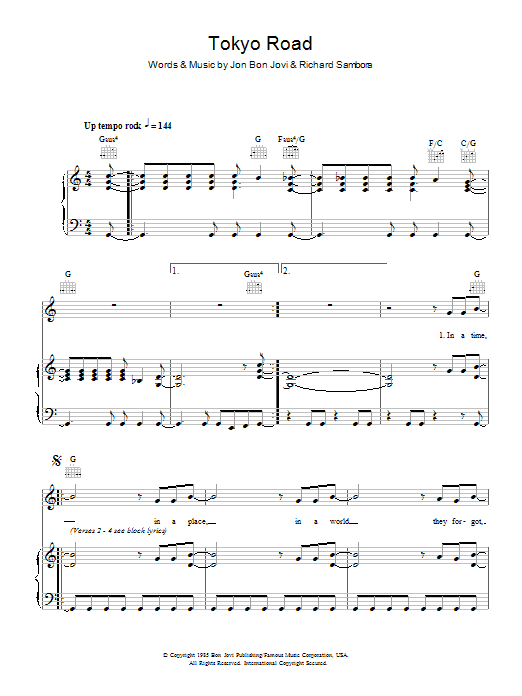 Download or print Bon Jovi Tokyo Road sheet music, chords and digital score arranged for Piano, Vocal & Guitar Chords. This Pop score includes 6 page(s).