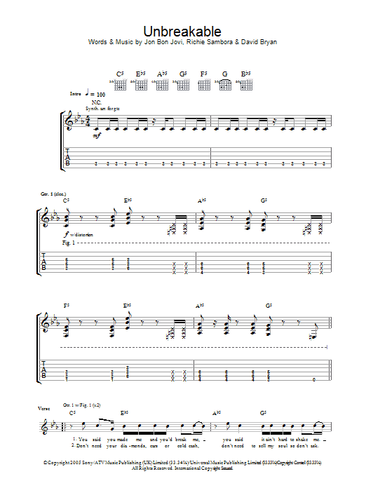 Download or print Bon Jovi Unbreakable sheet music, chords and digital score arranged for Guitar Tab. This Rock score includes 7 page(s).