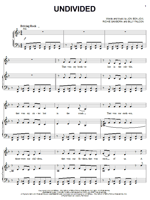 Download or print Bon Jovi Undivided sheet music, chords and digital score arranged for Piano, Vocal & Guitar Chords (Right-Hand Melody). This Pop score includes 7 page(s).