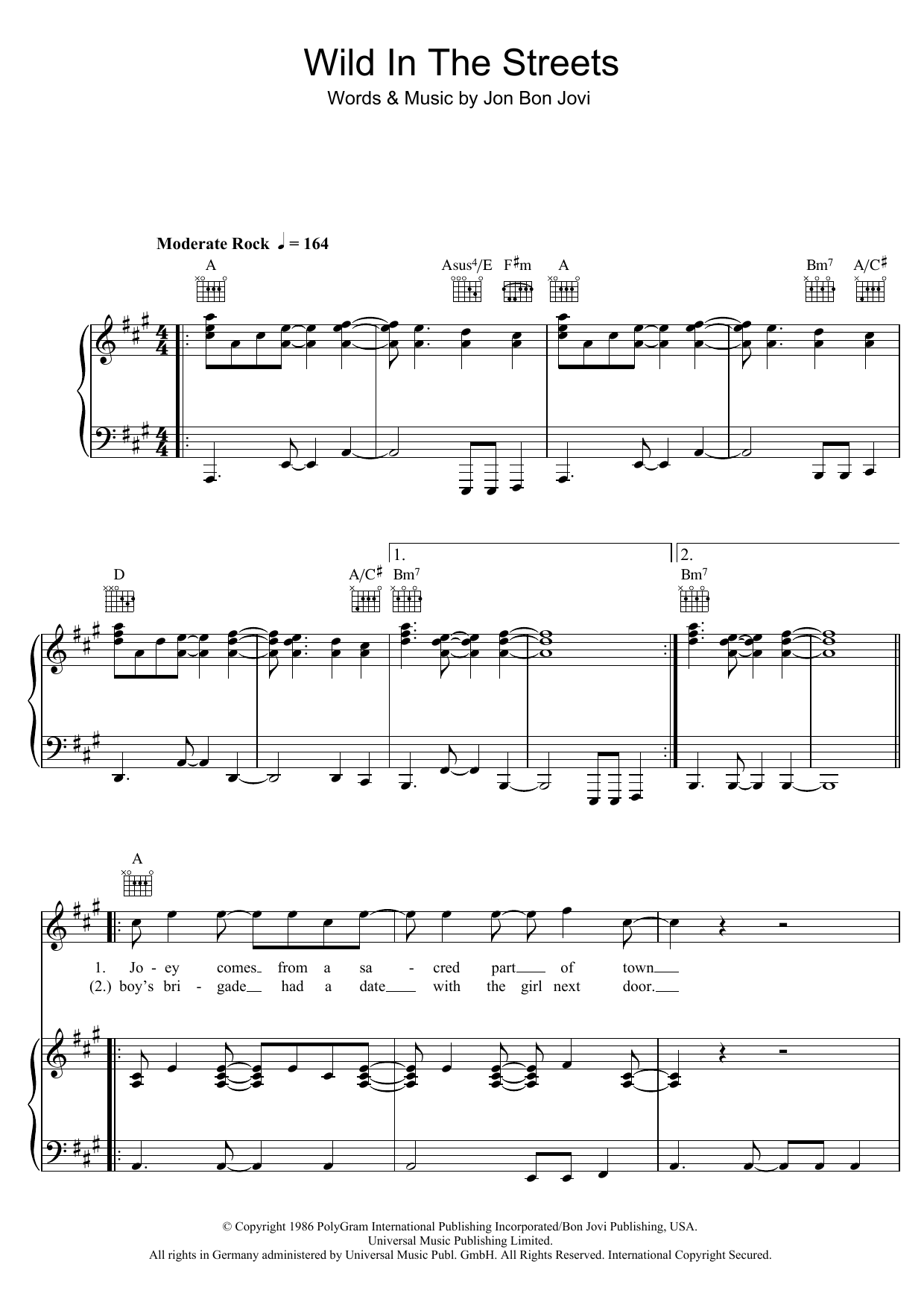 Download or print Bon Jovi Wild In The Streets sheet music, chords and digital score arranged for Piano, Vocal & Guitar Chords. This Pop score includes 8 page(s).