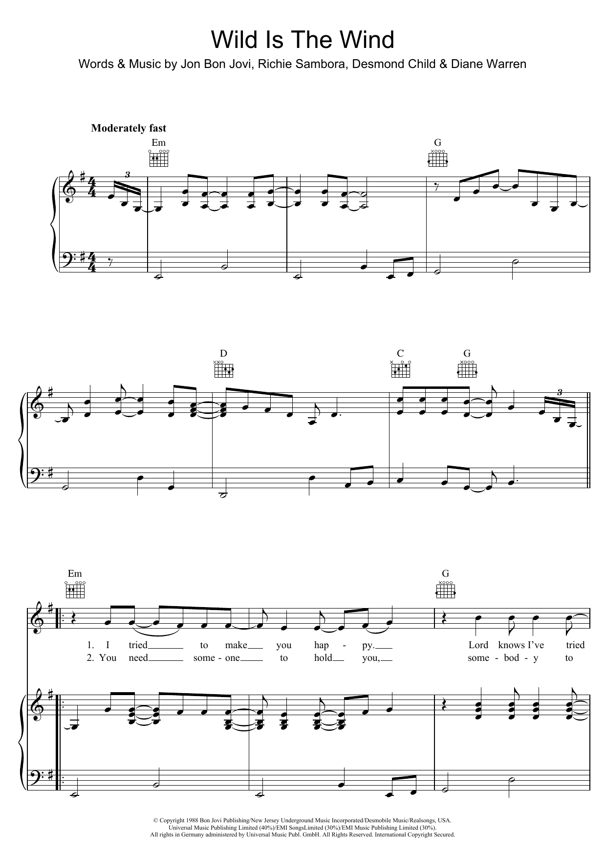 Download or print Bon Jovi Wild Is The Wind sheet music, chords and digital score arranged for Piano, Vocal & Guitar Chords. This Rock score includes 7 page(s).