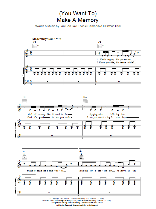 Download or print Bon Jovi (You Want To) Make A Memory sheet music, chords and digital score arranged for Piano, Vocal & Guitar Chords (Right-Hand Melody). This Metal score includes 7 page(s).
