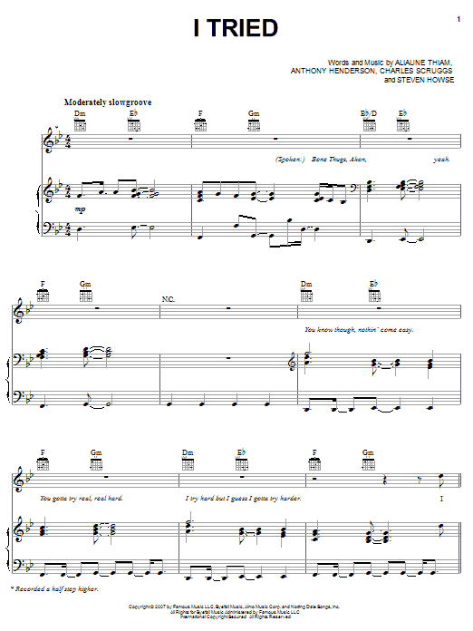 Download or print Bone Thugs-N-Harmony featuring Akon I Tried sheet music, chords and digital score arranged for Piano, Vocal & Guitar Chords (Right-Hand Melody). This Hip-Hop score includes 7 page(s).