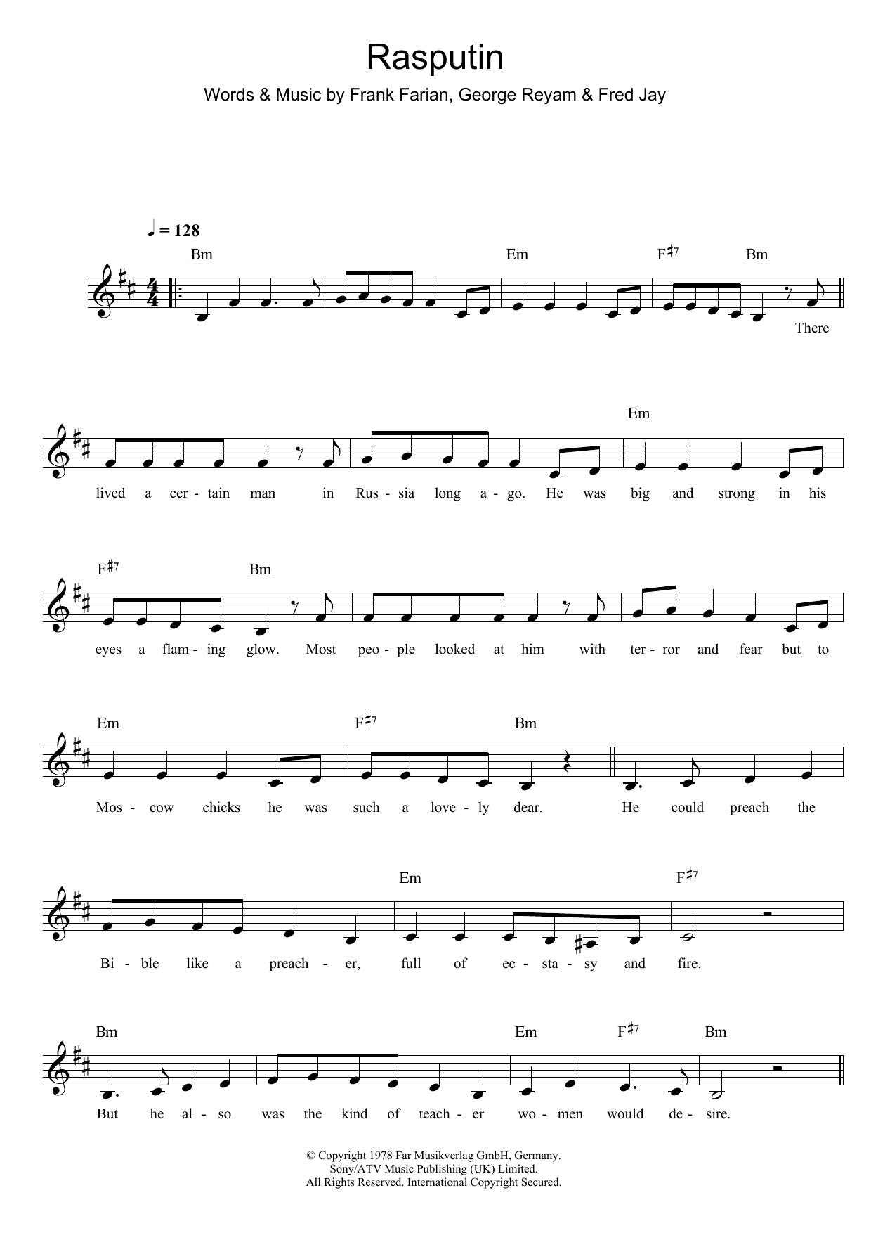 Download or print Boney M Rasputin sheet music, chords and digital score arranged for Piano Chords/Lyrics. This Disco score includes 2 page(s).