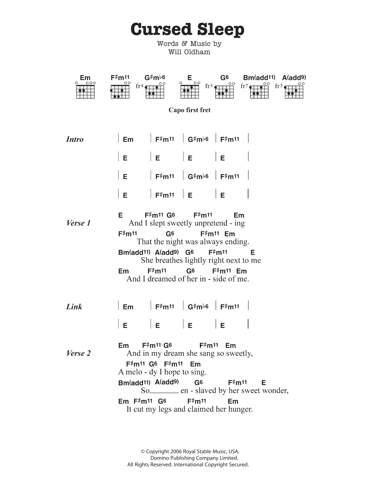 Download or print Bonnie ‘Prince’ Billy Cursed Sleep sheet music, chords and digital score arranged for Guitar Chords/Lyrics. This Pop score includes 3 page(s).